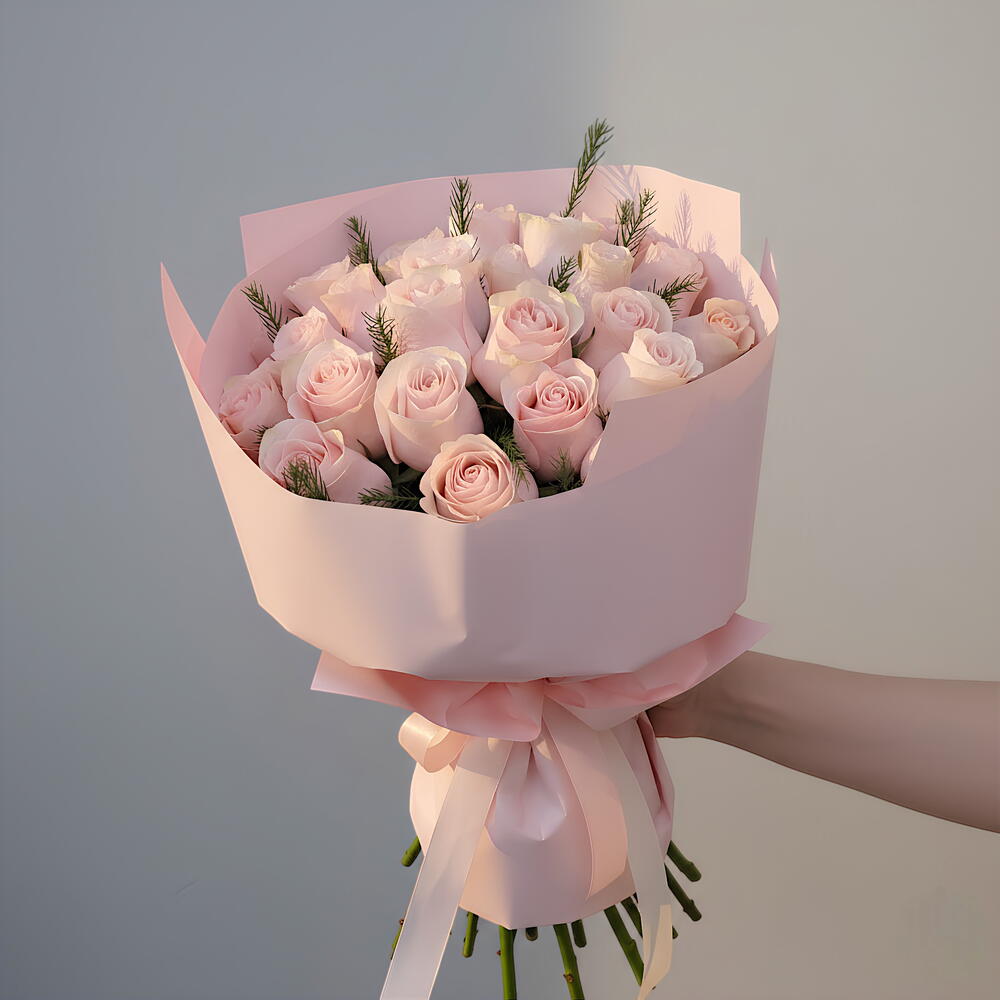 An elegant and refined mono bouquet, delightfully combining 25 buds of a noble Dutch rose and 3 sprigs of exotic pistachio. All of this is carefully wrapped in five sheets of aqua paper, which adds incredible softness and sophistication to the arrangement. Give this bouquet as a gift, and it will become an expressive sign of your attention and care for the recipient.