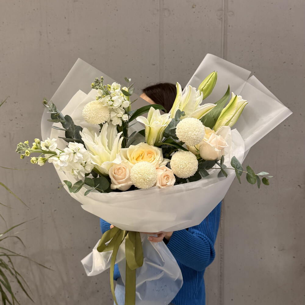 Matthiola - 2 pcs Rose - 5 pcs Eucalyptus cinerea - 2 pcs Lily peony - 2 pcs momoko chrysanthemum - 4 pcs