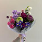 Нежный, но яркий букет в холодно-фиолетовой палитре для тех, кто любит необычную флористику. В составе розовые кустовые розы, фиолетовые гвоздики, ирисы с жёлтыми акцентами, декоративные шаровидные соцветия и фактурная эустома. Контраст насыщенных ягодных оттенков и свежей зелени создаёт ощущение глубины, а собранные вместе цветы выглядят как маленькая вселенная красок и форм. Идеален для подарка, когда хочется впечатлить, удивить и сказать «ты особенная».