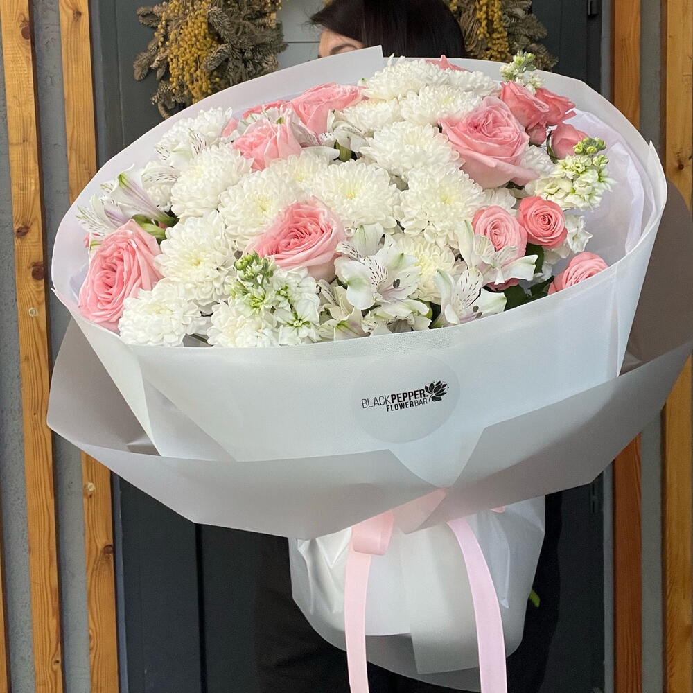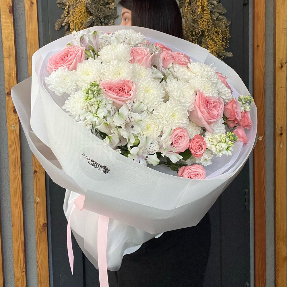Alstroemeria - 4 pcs Matthiola - 3 pcs Chrysanthemum bush - 5 pcs Rose - 7 pcs Bush rose - 4 pcs