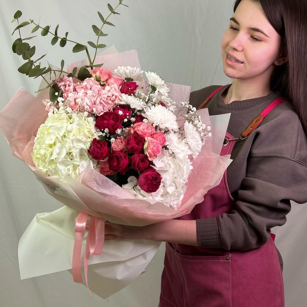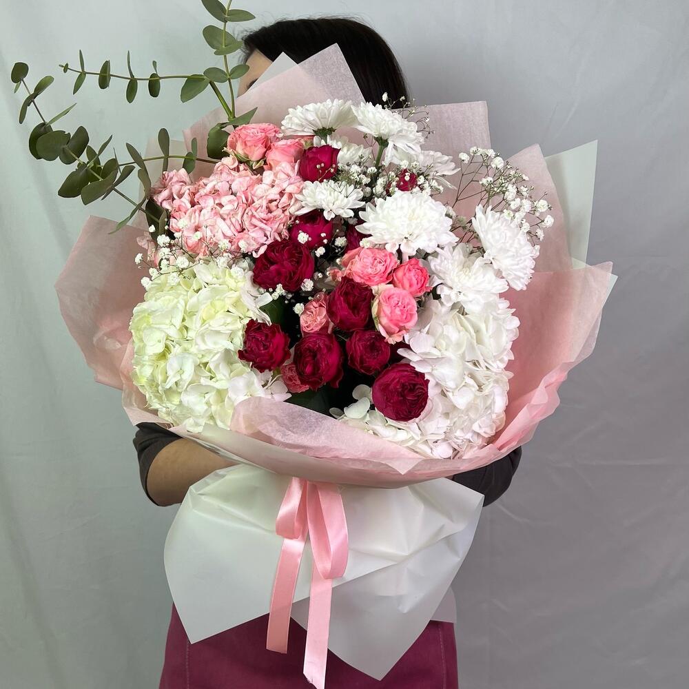 Gypsophila - 3 pcs Hydrangea - 3 pcs Eucalyptus - 2 pcs Bush rose - 4 pcs