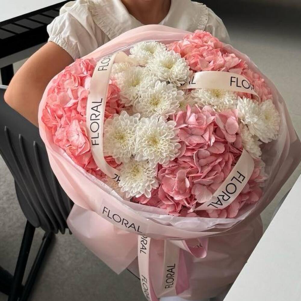 Окунитесь в мир невероятной красоты и изысканности с этим авторским букетом. Драгоценная Гортензия, славящаяся своим изысканным очарованием, замечательно сочетается с изысканными кустовыми хризантемами, создавая букет, полный нежной элегантности и утонченной прелестью. Без дополнительных украшений, эти цветы говорят сами за себя, делая данный букет идеальным выбором для любого особенного случая.