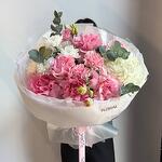 Hydrangea - 1 pcs Lisianthus - 2 pcs Eucalyptus - 1 pcs Rose - 5 pcs Carnation - 3 pcs chrysanthemum premium - 1 pcs