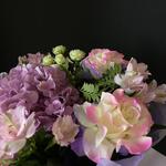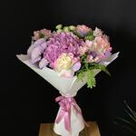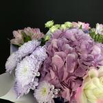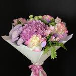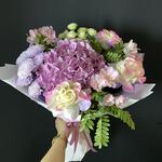 Alstroemeria - 3 pcs Hydrangea - 1 pcs Chrysanthemum bush - 1 pcs Ecuador Rose - 3 pcs Rose Spray - 1 pcs Design matte film - 1 pcs a postcard with your wishes - 1 pcs пимташка - 2 pcs