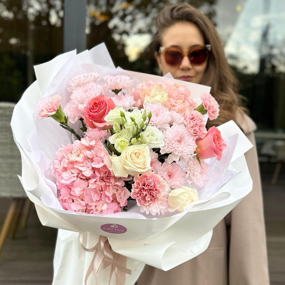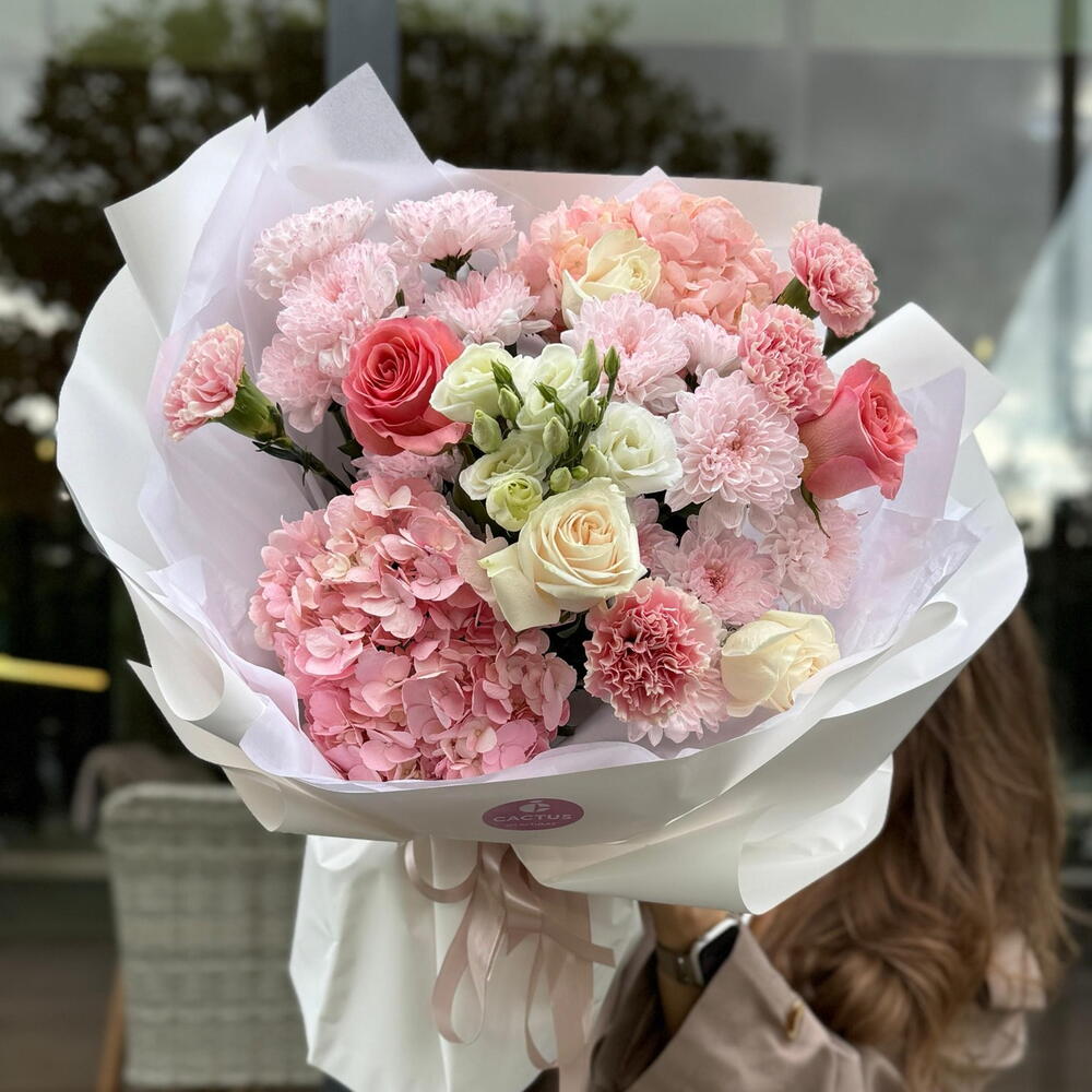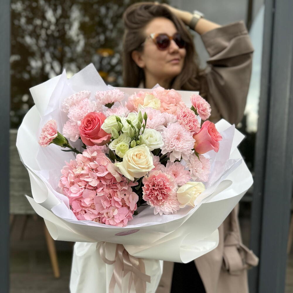 Hydrangea - 2 pcs Chrysanthemum bush - 2 pcs Rose - 5 pcs Eustoma - 1 pcs Dianthus - 4 pcs