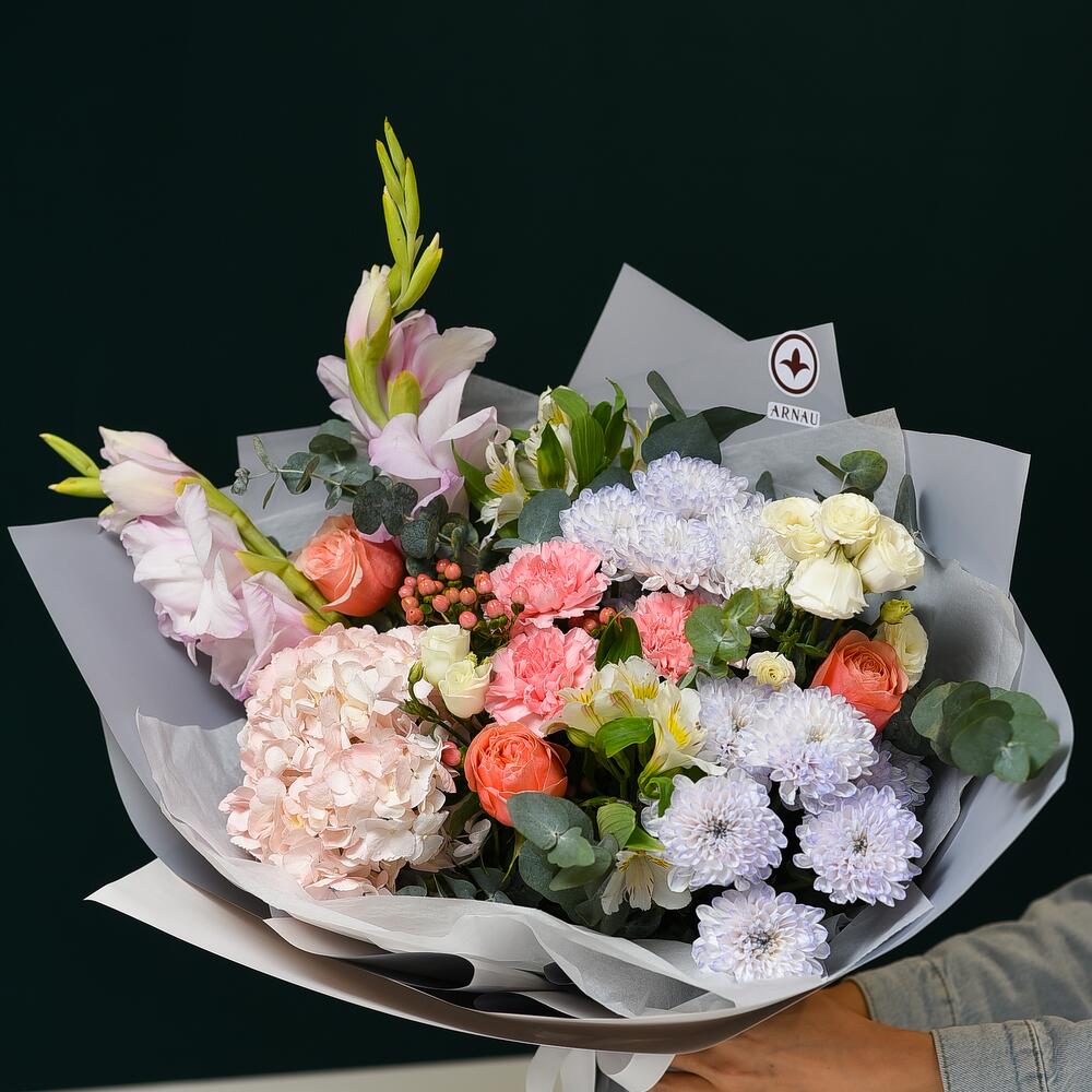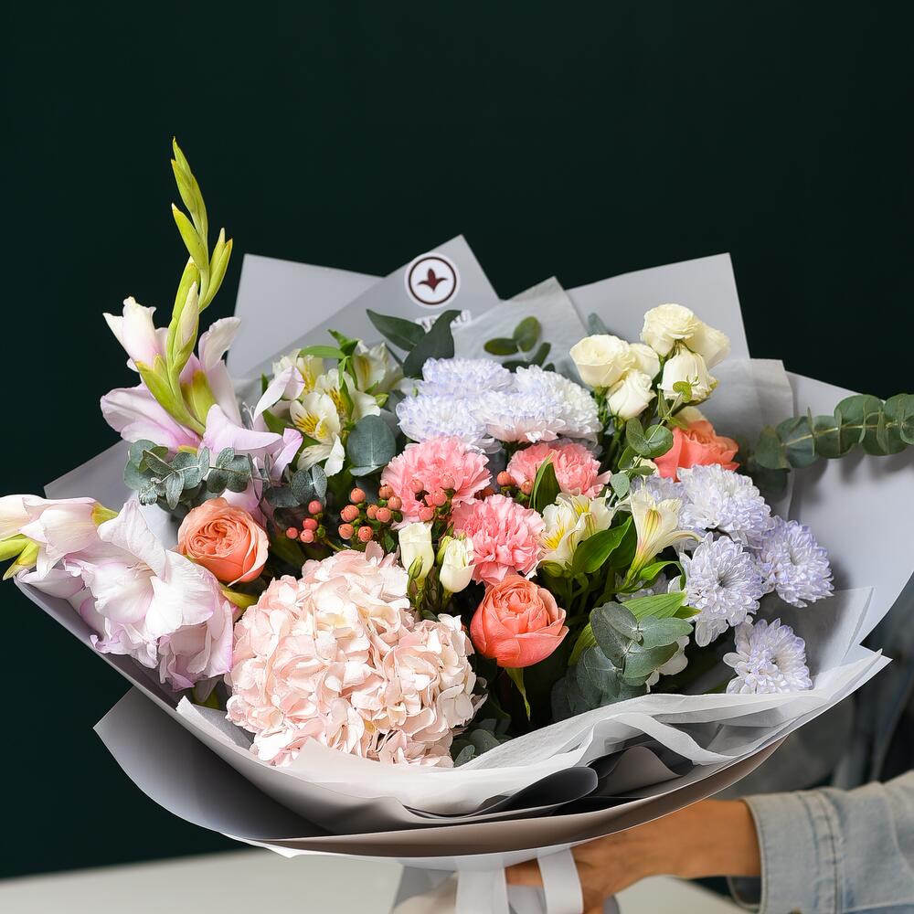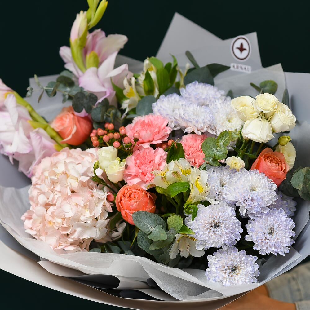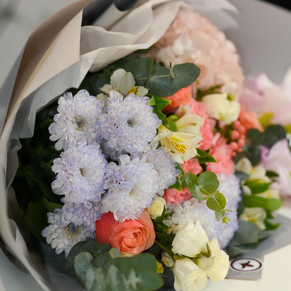 Alstroemeria - 2 pcs Hypericum - 2 pcs Hydrangea - 1 pcs Eucalyptus - 3 pcs Chrysanthemum - 2 pcs Packaging - 1 pcs Eustoma - 2 pcs Dianthus - 3 pcs Peony-like rose - 3 pcs