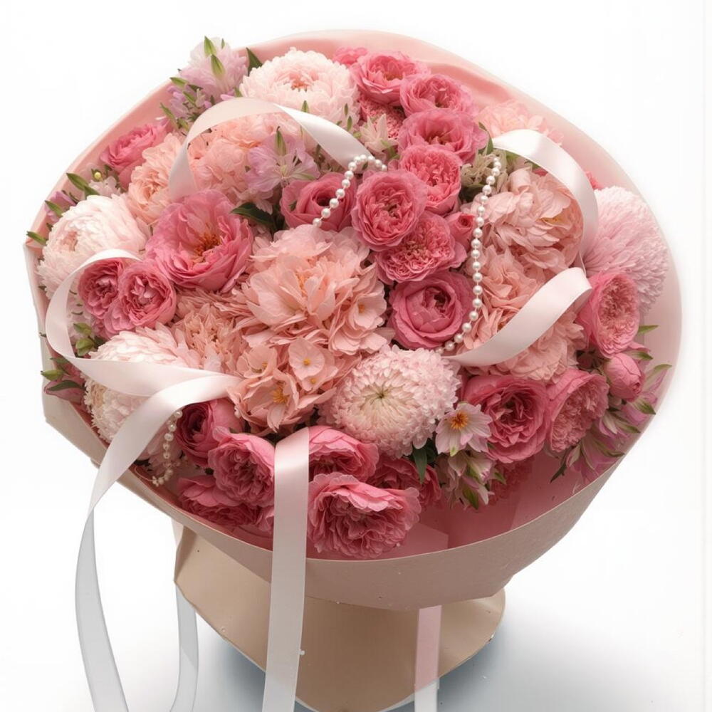 Alstroemeria - 10 pcs Hydrangea - 3 pcs Chrysanthemum bush - 5 pcs Bush rose peony - shaped - 5 pcs pink express rose - 7 pcs