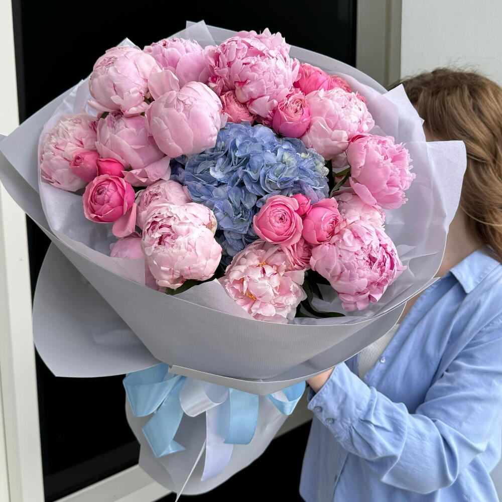 Hydrangea - 1 pcs Peony - 15 pcs Bush rose - 4 pcs Designer packaging - 10 pcs