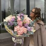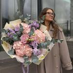 Hydrangea - 3 pcs Matthiola - 3 pcs Eucalyptus - 4 pcs Rose - 2 pcs Eustoma - 1 pcs