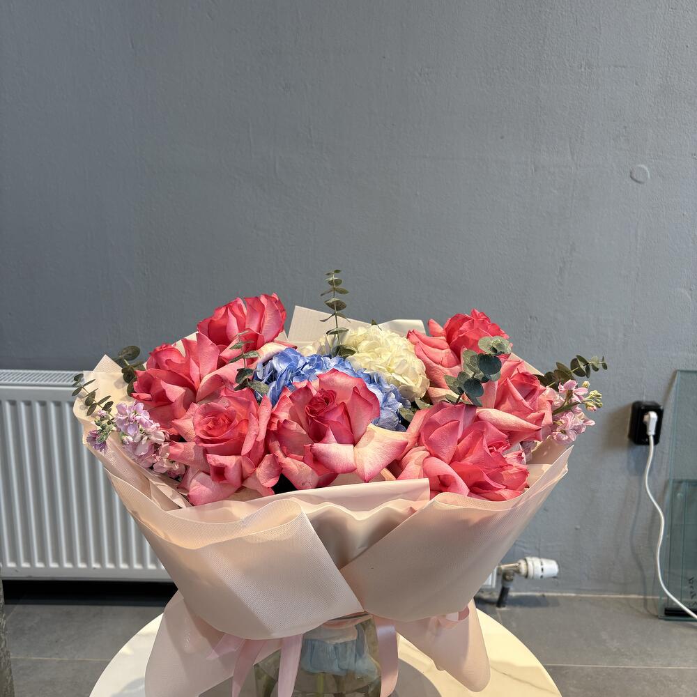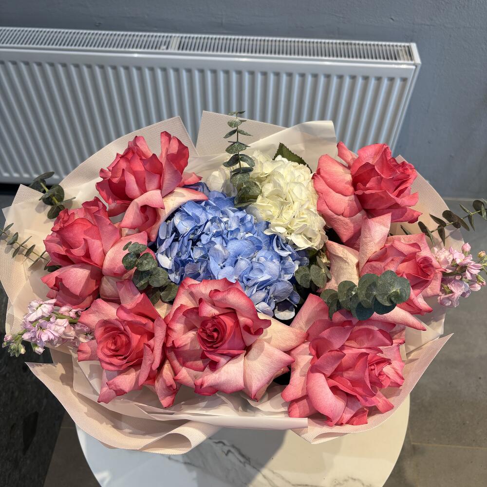 Hydrangea - 2 pcs Eucalyptus - 7 pcs Rose - 7 pcs Eustoma - 1 pcs