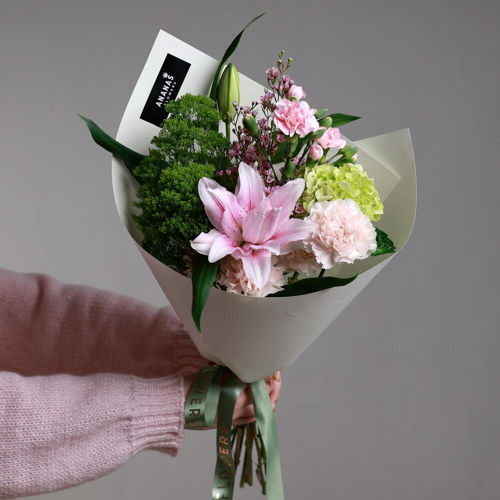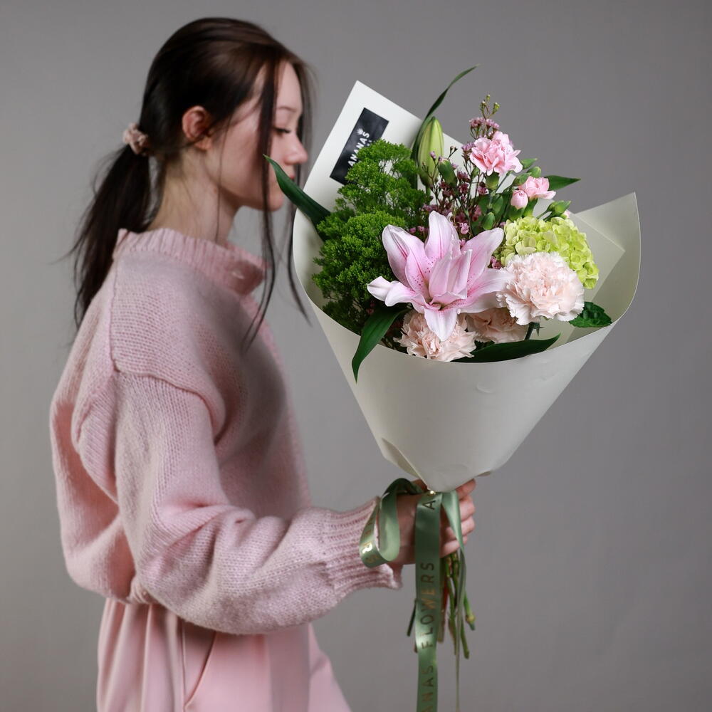 Viburnum - 1 pcs Trachelium - 2 pcs Carnation - 3 pcs Spray carnation - 1 pcs Chamelaucium - 1 pcs Designer packaging - 1 pcs Lily varietal - 1 pcs
