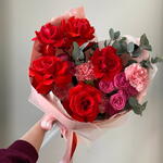 Eucalyptus - 1 pcs Packaging - 1 pcs Carnation - 4 pcs Rose bush peony - shaped - 2 pcs Rose Ecuador 50 cm - 5 pcs