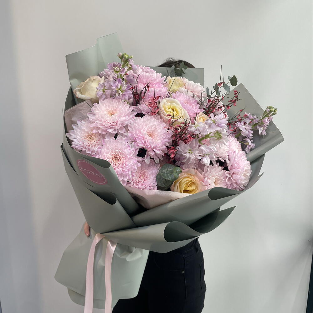 Matthiola - 2 pcs Eucalyptus - 1 pcs Rose - 5 pcs Chrysanthemum - 4 pcs Genista - 2 pcs