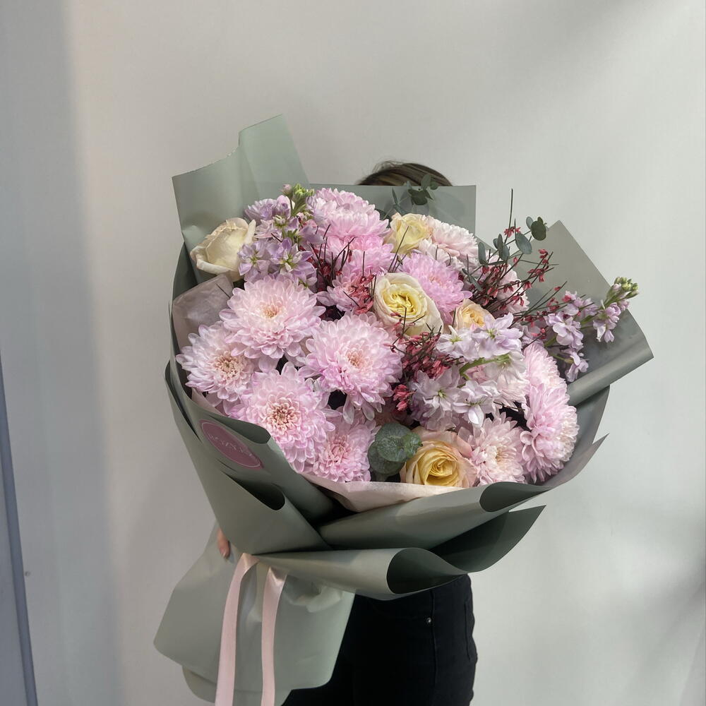 Matthiola - 2 pcs Chrysanthemum bush - 4 pcs Eucalyptus - 1 pcs Rose - 5 pcs genista pink - 2 pcs