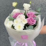 Chrysanthemum bush - 1 pcs Eucalyptus - 1 pcs Rose - 3 pcs Satin ribbon - 1 pcs Dahlia - 1 pcs eustoma white - 1 pcs Tracing paper packaging - 3 pcs aquabumage - 4 pcs