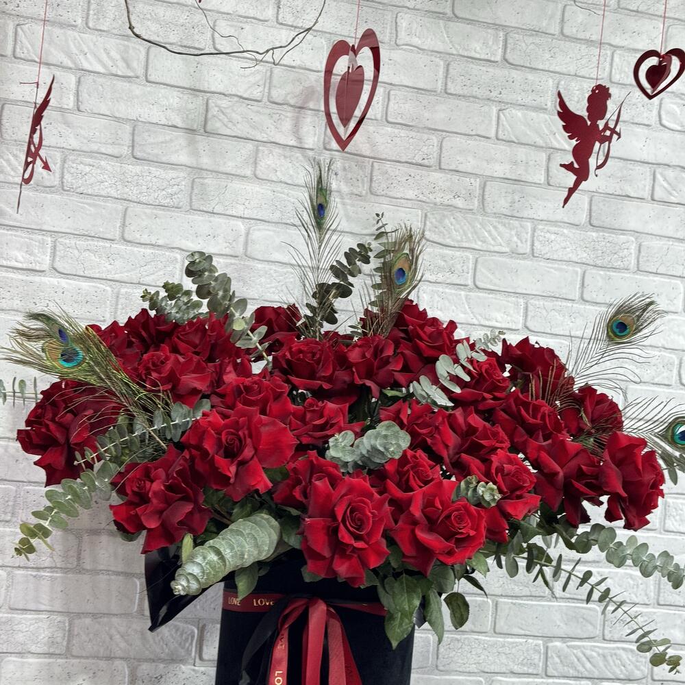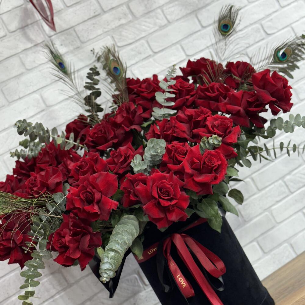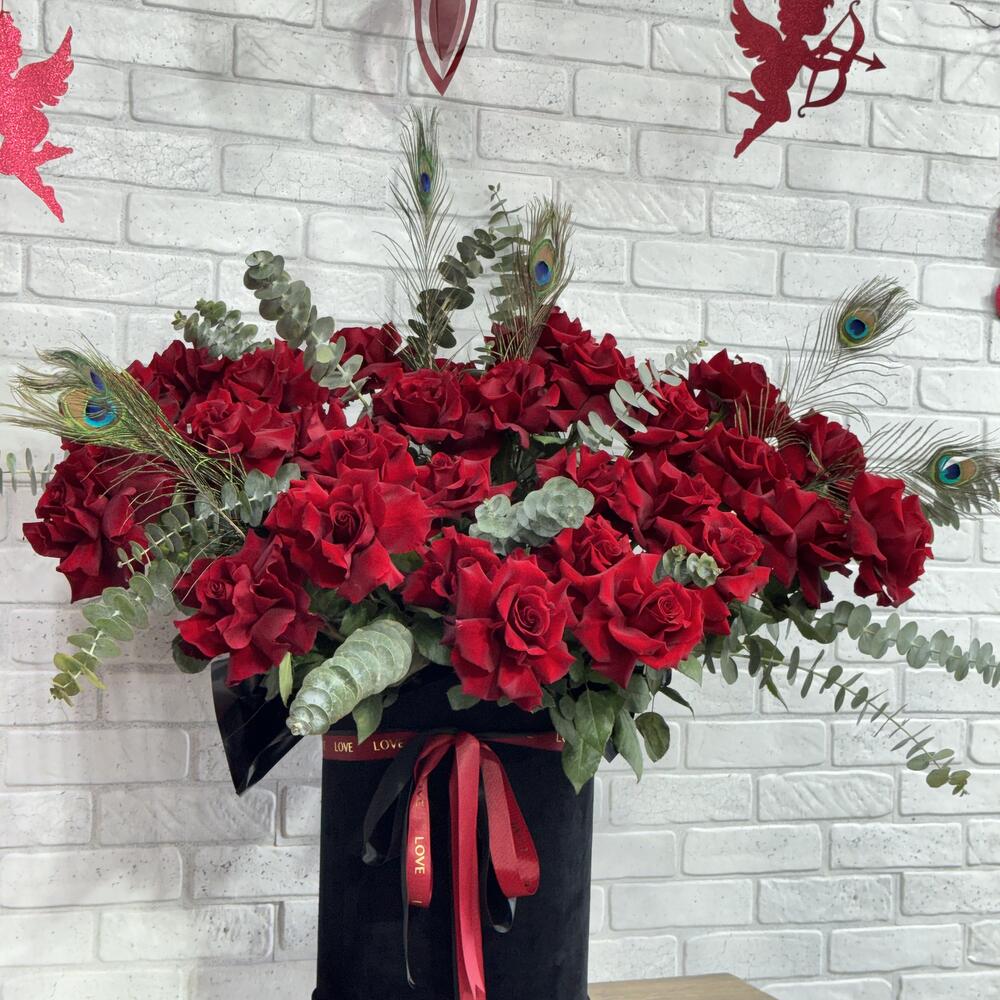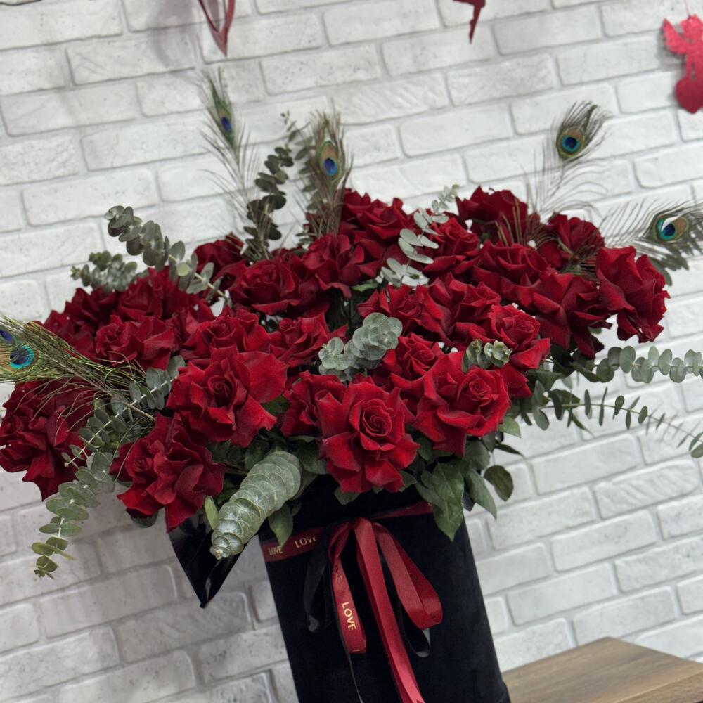 Tape - 2 pcs Eucalyptus - 11 pcs French Rose - 35 pcs Velvet Box - 1 pcs Floral oasis - 2 pcs peacock feather - 5 pcs