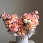 Композиция в стильной коробке из роскошных роз с персиковым оттенком и лёгкими гвоздиками. Напоминает утонченную мелодию пудровых оттенков.