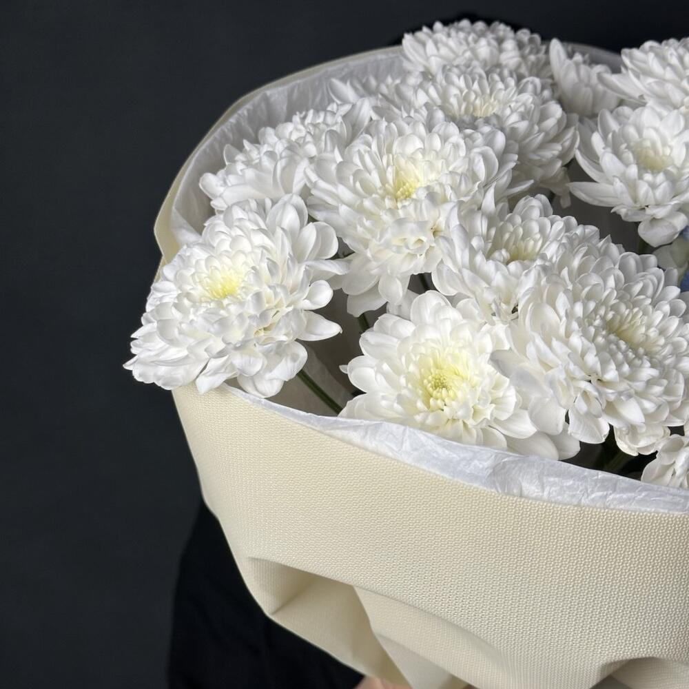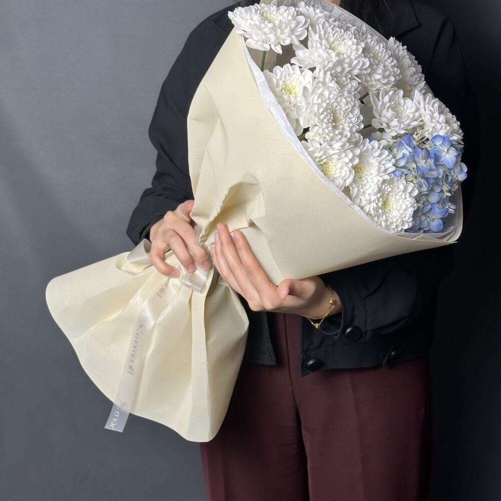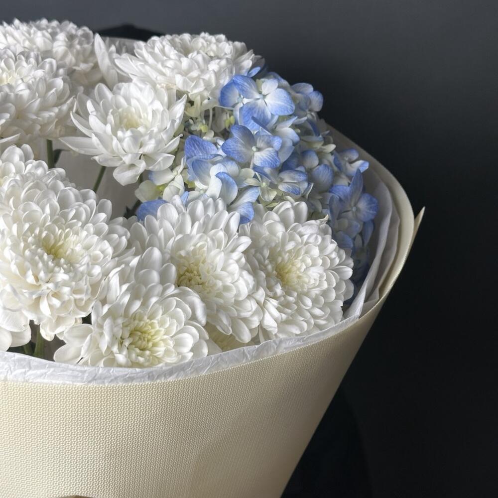 Hydrangea - 1 pcs Chrysanthemum bush - 3 pcs Satin ribbon - 1 pcs Silence - 3 pcs Designer packaging - 2 pcs