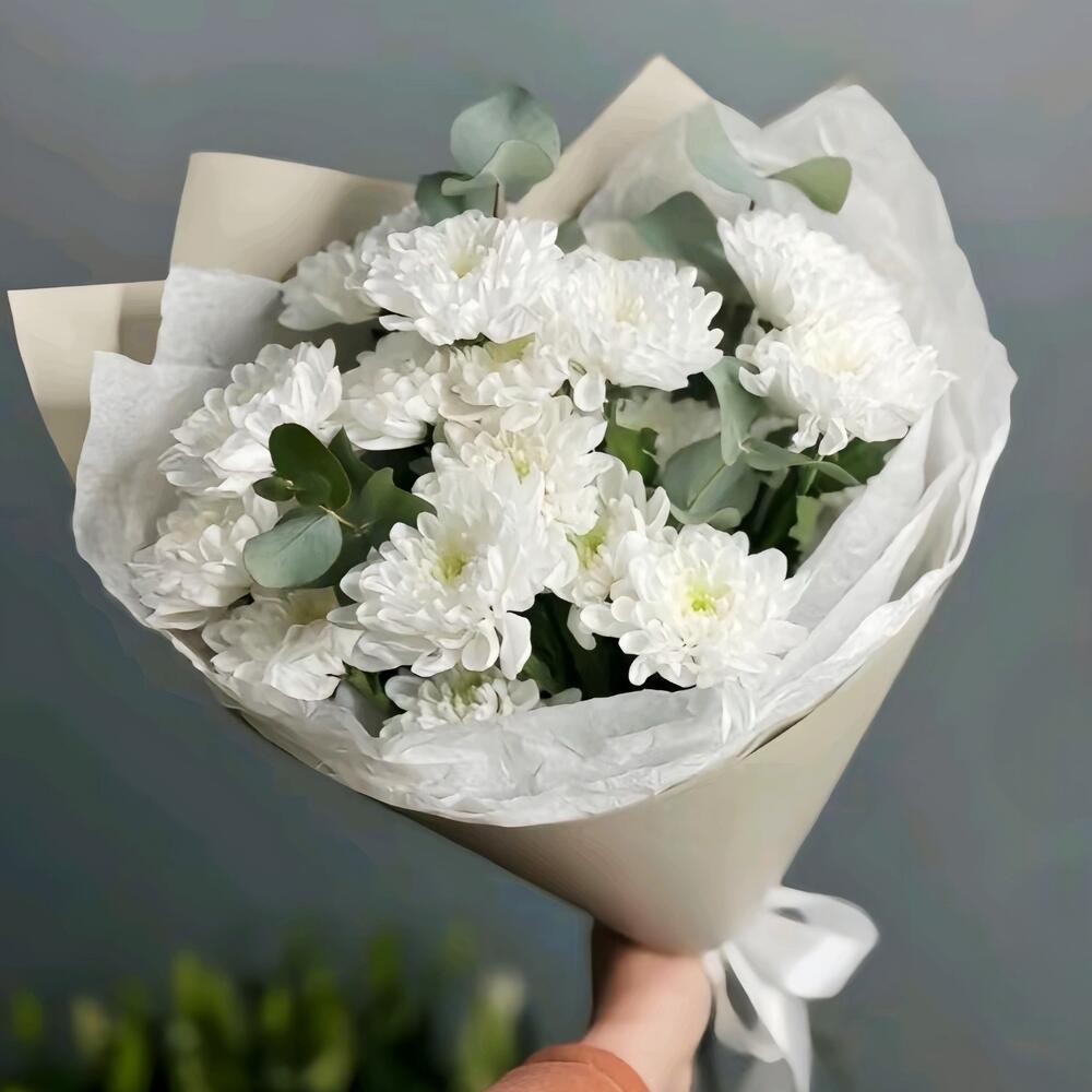 Идеальный букет для тех, кто говорит без слов. Нежные белые хризантемы, символ искренности и спокойствия, обрамлены эвкалиптом и заботливо упакованы в светлую упаковку. Подойдёт для любого повода — от благодарности до поддержки или просто знака внимания. Универсальный, элегантный, душевный.