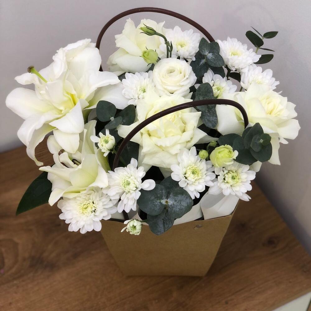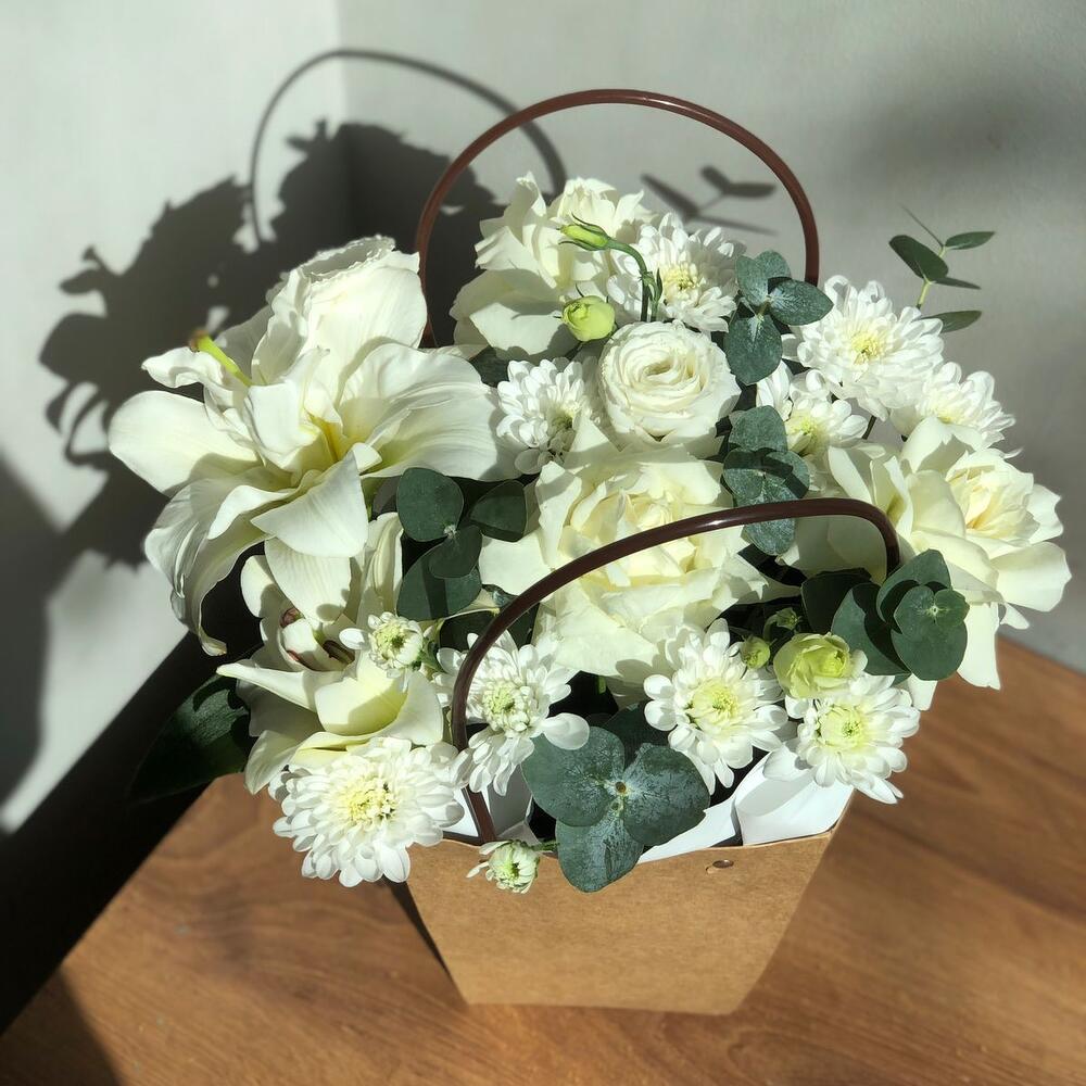 Lisianthus - 1 pcs Lily - 1 pcs Eucalyptus - 2 pcs Rose - 3 pcs Chrysanthemum - 1 pcs