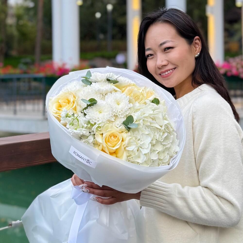 Hydrangea - 1 pcs Matthiola - 1 pcs Chrysanthemum bush - 3 pcs Eucalyptus - 1 pcs candelight - 4 pcs
