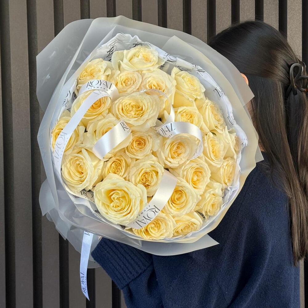 Композиция из 25 белоснежной пионовидной розы с добавлением изящных веточек эвкалипта. Букет оформлен в стильную белую крафтовую бумагу, что подчеркивает его чистоту и элегантность. Идеальный выбор для свадеб, юбилеев или в знак искренних чувств.