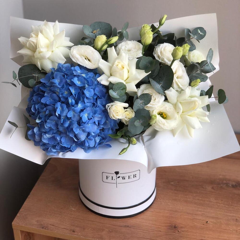Hydrangea - 1 pcs Lisianthus - 2 pcs Eucalyptus - 2 pcs roses - 3 pcs