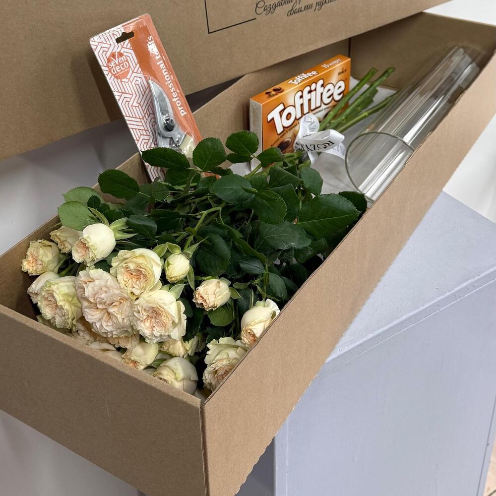 Состав бокса «Сам себе флорист» Роза кустовая-5 веток Ваза-1 штука Секатор-1 штука Конфеты Тофифи 125гр-1 штука