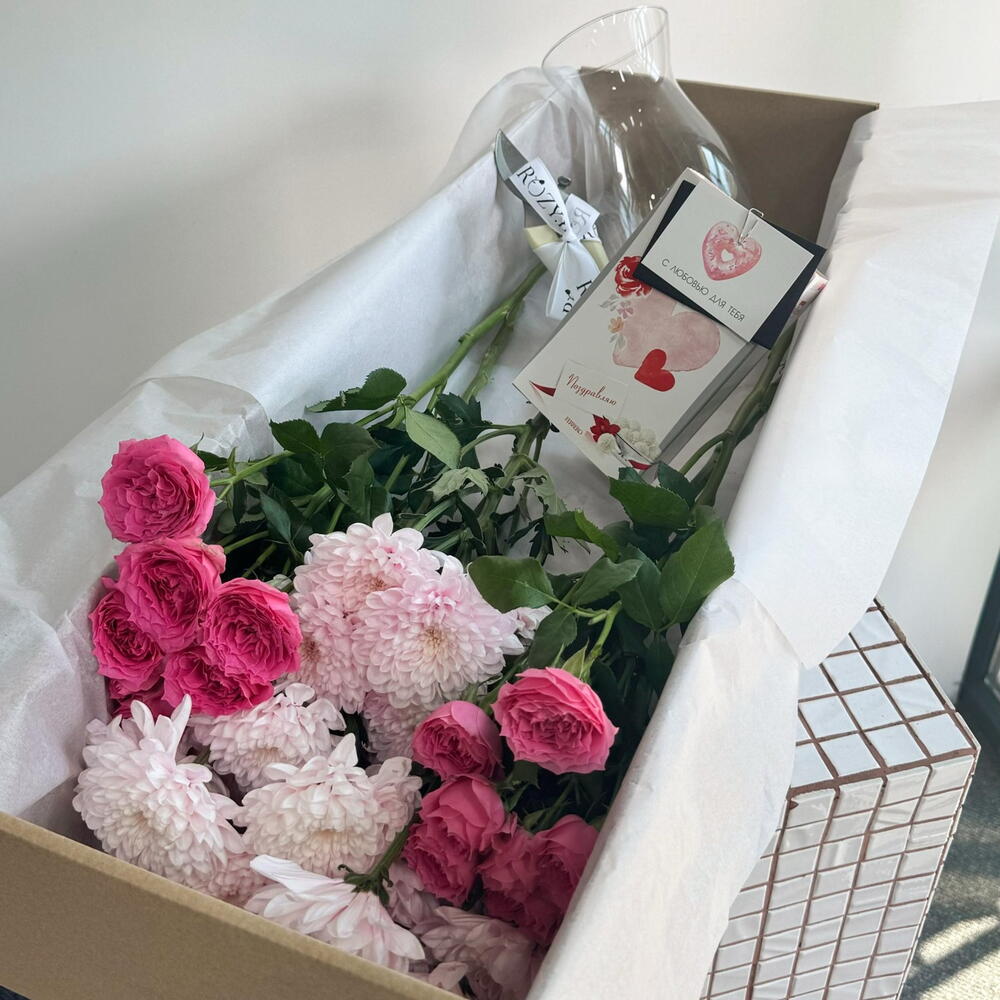 Chrysanthemum bush - 3 pcs Bush rose - 2 pcs Raffaello - 70 g Vase glass - 1 pcs Mini Postcard - 1 pcs бокс «сам себе флорист» - 1 pcs сакатор - 1 pcs