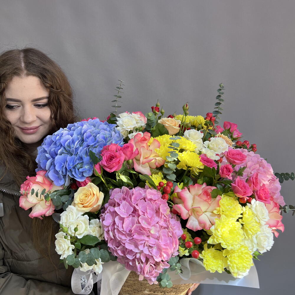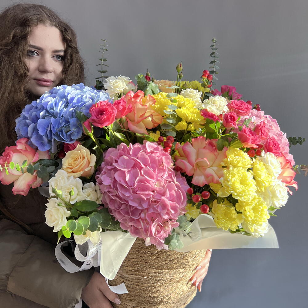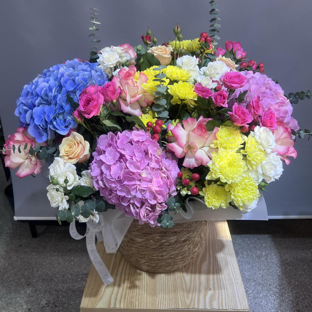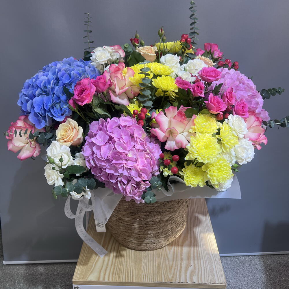 Rose Jumilia - 8 pcs Eucalyptus Mix - 3 pcs Basket wicker - 1 pcs chrysanthemum altai - 3 pcs rose spray mix - 5 pcs hydrangea premium mix - 3 pcs роза спрей софия - 3 pcs