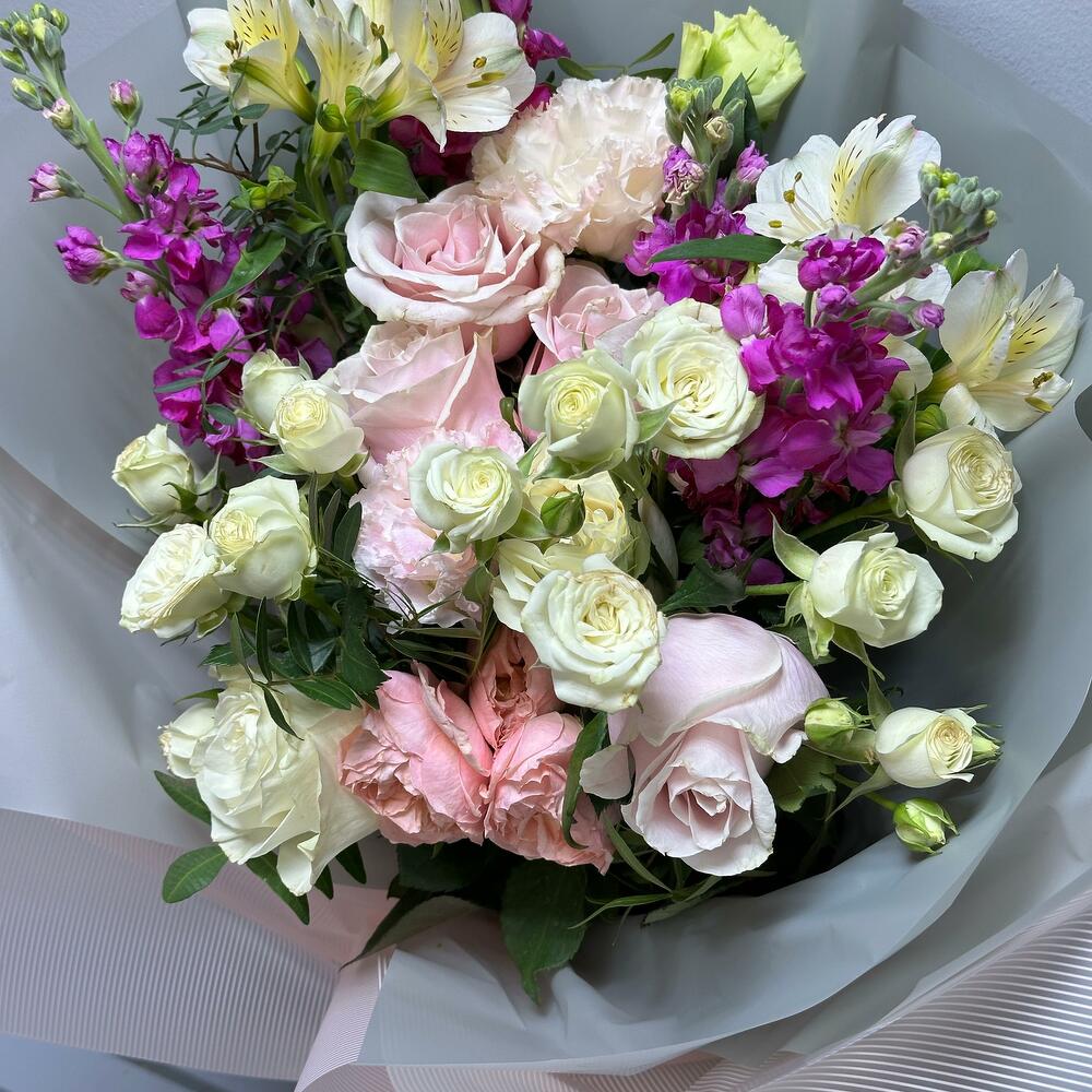 Bouquet “Pink Waltz" This bouquet is like a gentle melody, full of lightness and harmony. Four delicate pink roses create the basis of the composition, filling it with softness and warmth. White spray roses and alstroemeria add sophistication and light radiance, like the first rays of dawn. Purple matiolla adds a touch of mystery and sophistication, while white lisianthus and pistachio greens add freshness and lightness to the bouquet. The design in delicate pink stripes with translucent gray aqua paper highlights the elegance of the composition, creating a stylish and modern look. The finishing touch is a turnip ribbon in a delicate pink shade, adding grace and sophistication. Give a light dance of feelings and beauty — a bouquet that will touch your heart at first sight. ✨🌸
