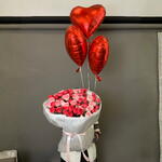 Bouquet of 19 spray roses in two shades, complemented by three heart-shaped balloons. A great gift option for a girlfriend on February 14.