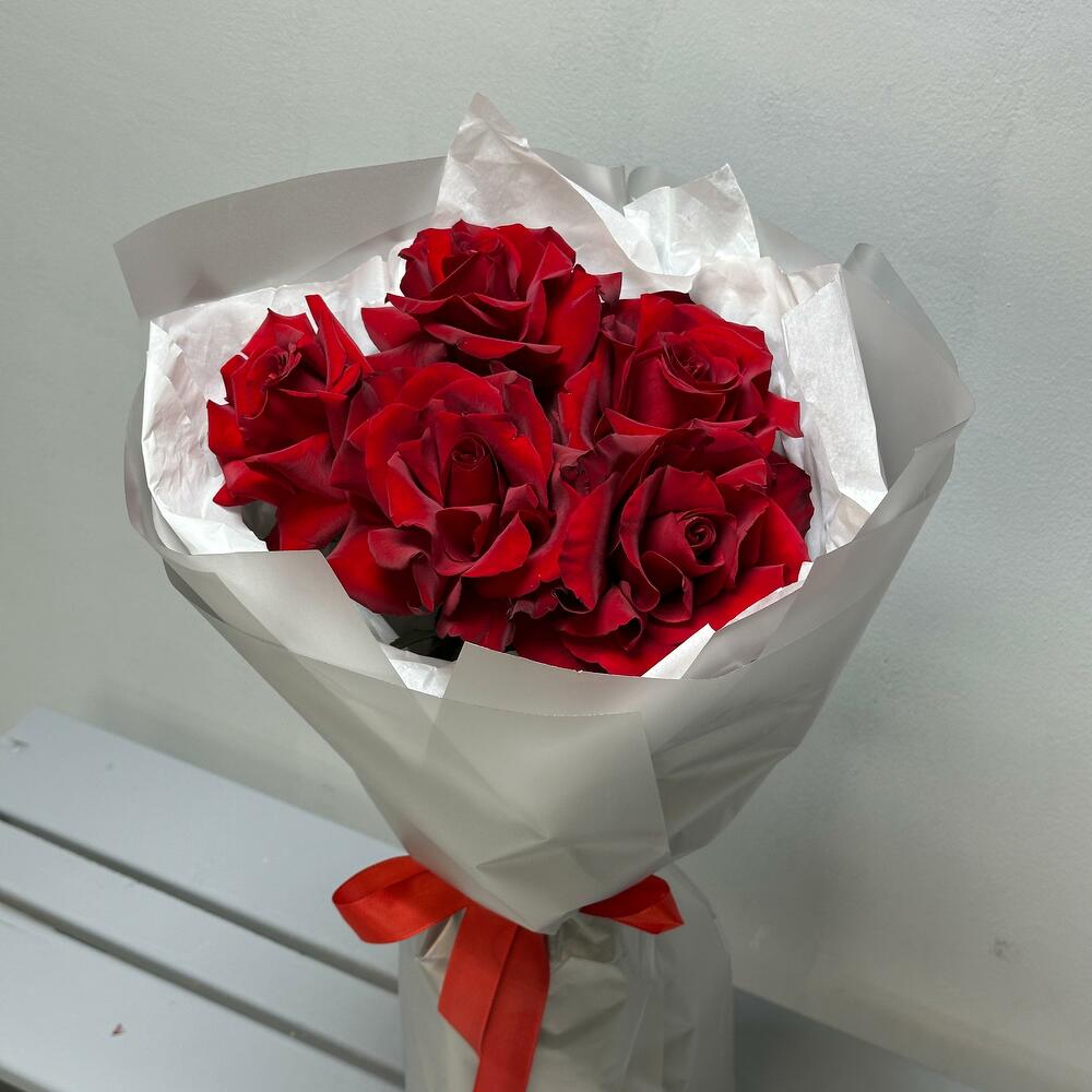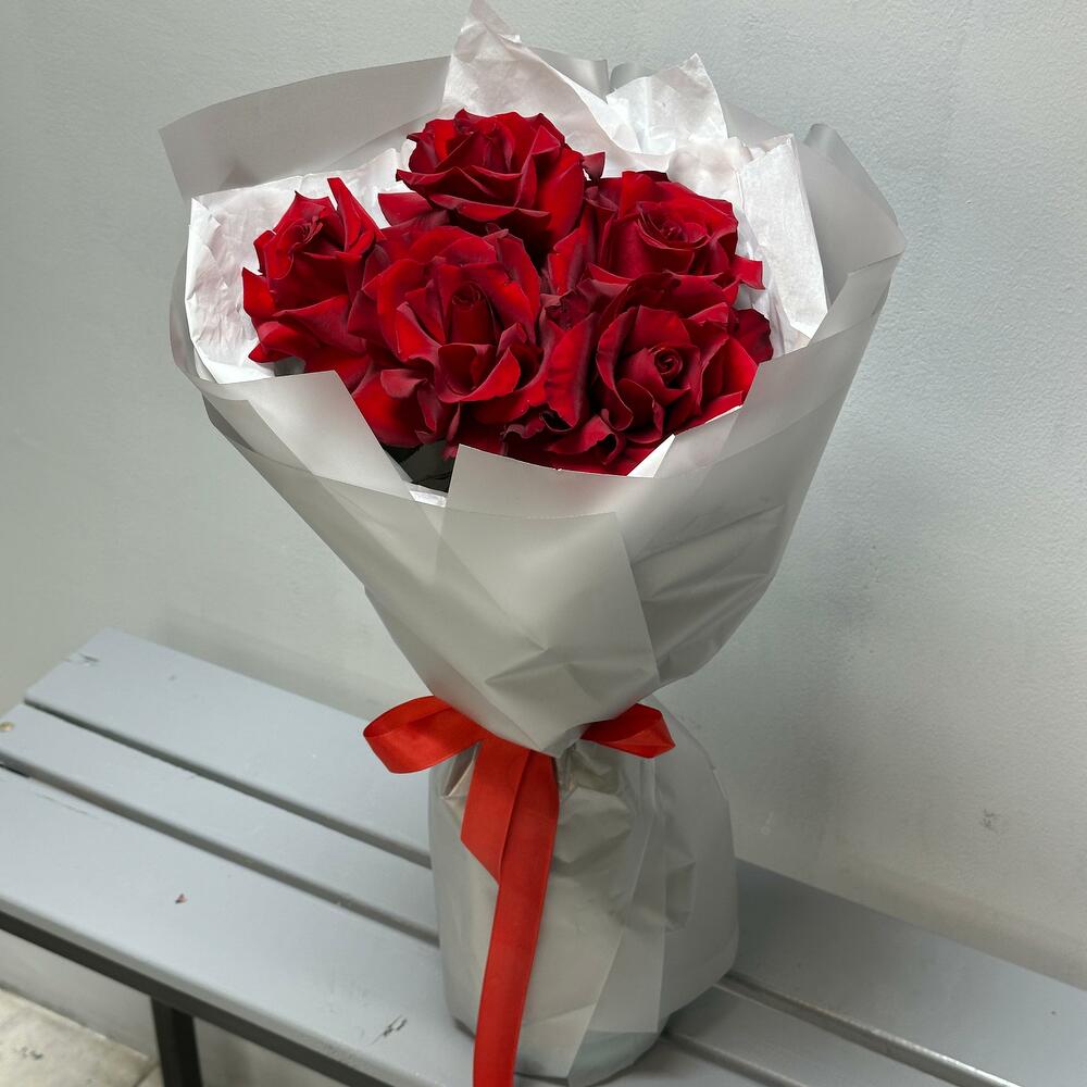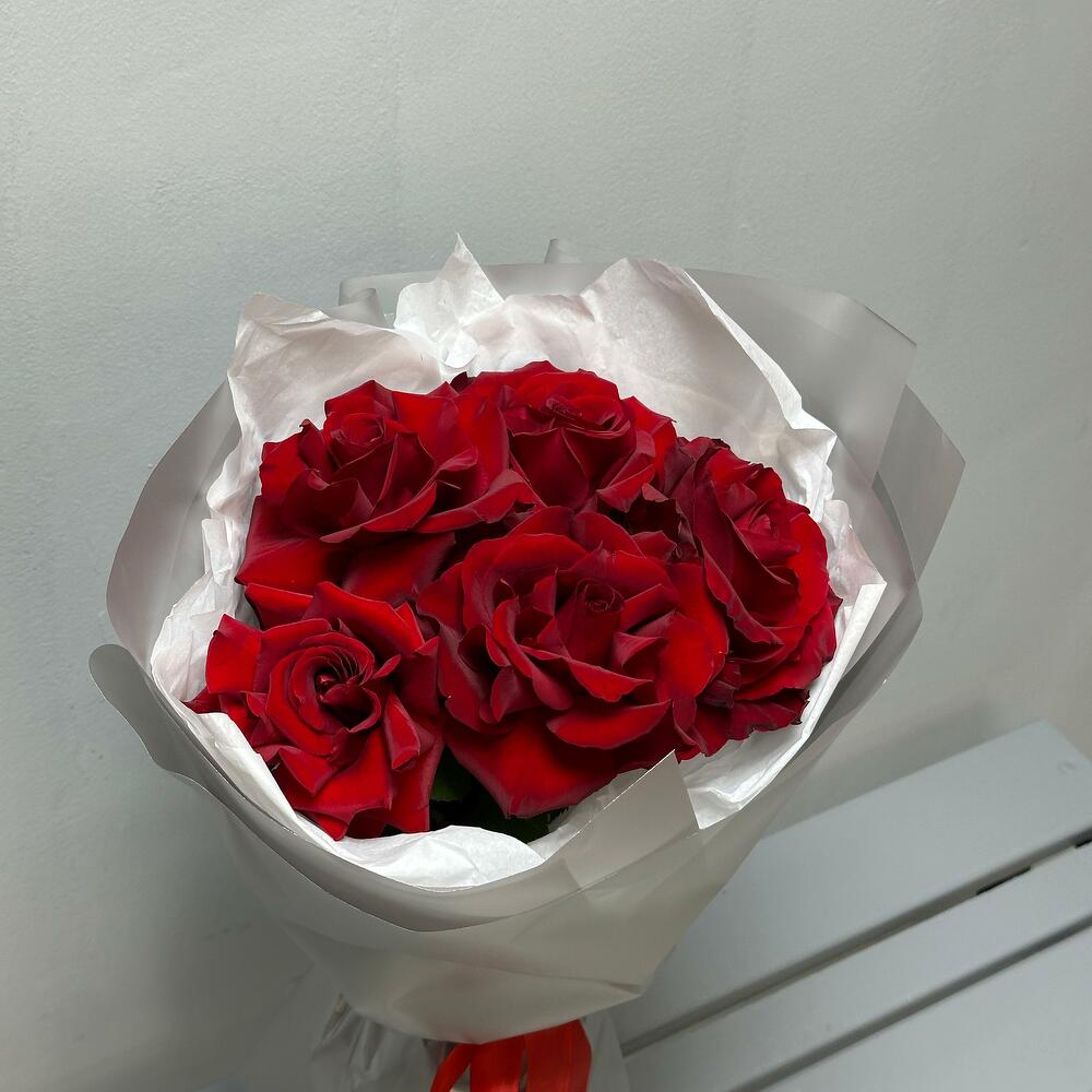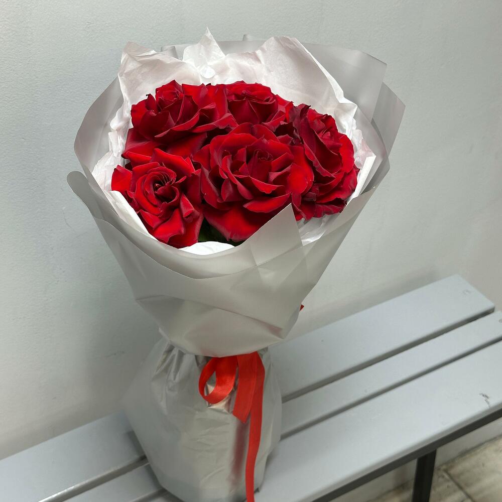 Букет «Классика страсти» ❤✨ Стильный и лаконичный букет, в котором каждая деталь выражает глубину чувств. 5 алых роз 🌹 — символ любви, страсти и преданности, их бархатные лепестки передают самые искренние эмоции. Элегантное оформление в серой аква-бумаге с белым тишью 🌫 создаёт утончённый контраст, подчёркивая благородство цветов. Завершающий штрих — алый репсовый бант 🎀, добавляющий букеты нотку торжественности. Этот букет — идеальный выбор для выражения чувств, будь то признание, поздравление или знак уважения! 🔥💕