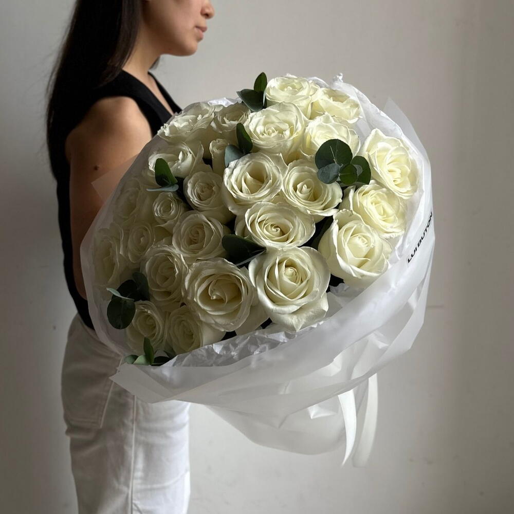Окунитесь в мир изысканности и гармонии с нашим монобукетом. Состоящий из 25 бархатных роз величественного оттенка, он дополнен ароматным эвкалиптом, количество которого составляет 6 штук. Этот букет станет прекрасным подарком для любого праздника и способен выразить самые нежные чувства.
