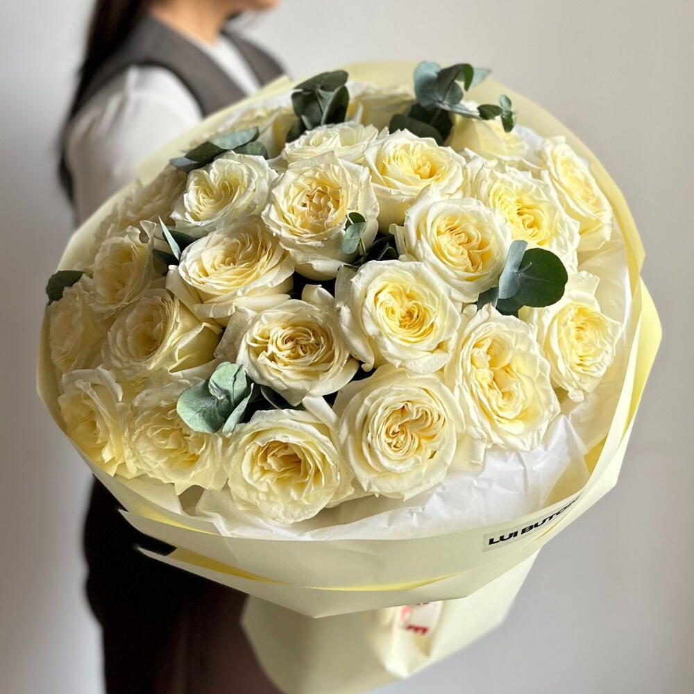 Букет "25 пионовидных роз Candlelight с эвкалиптом"