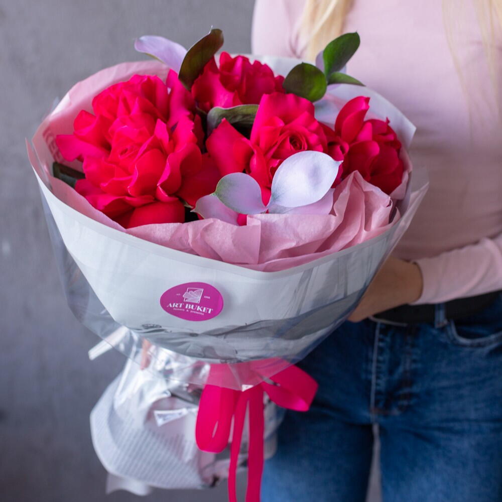 Tape - 1 pcs The language is Russian. Here is the translation to English: "Ruscus" - 5 pcs Decoration - 1 pcs Pink Floyd Rose - 5 pcs