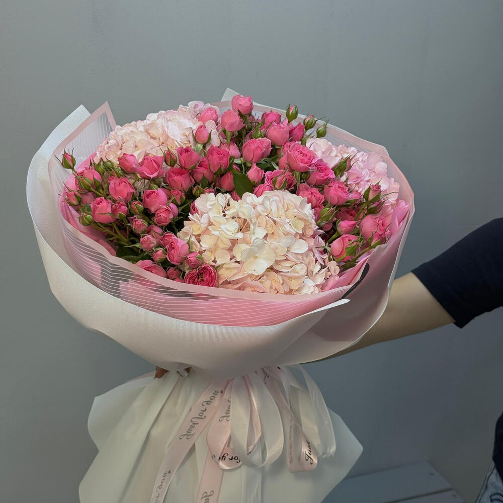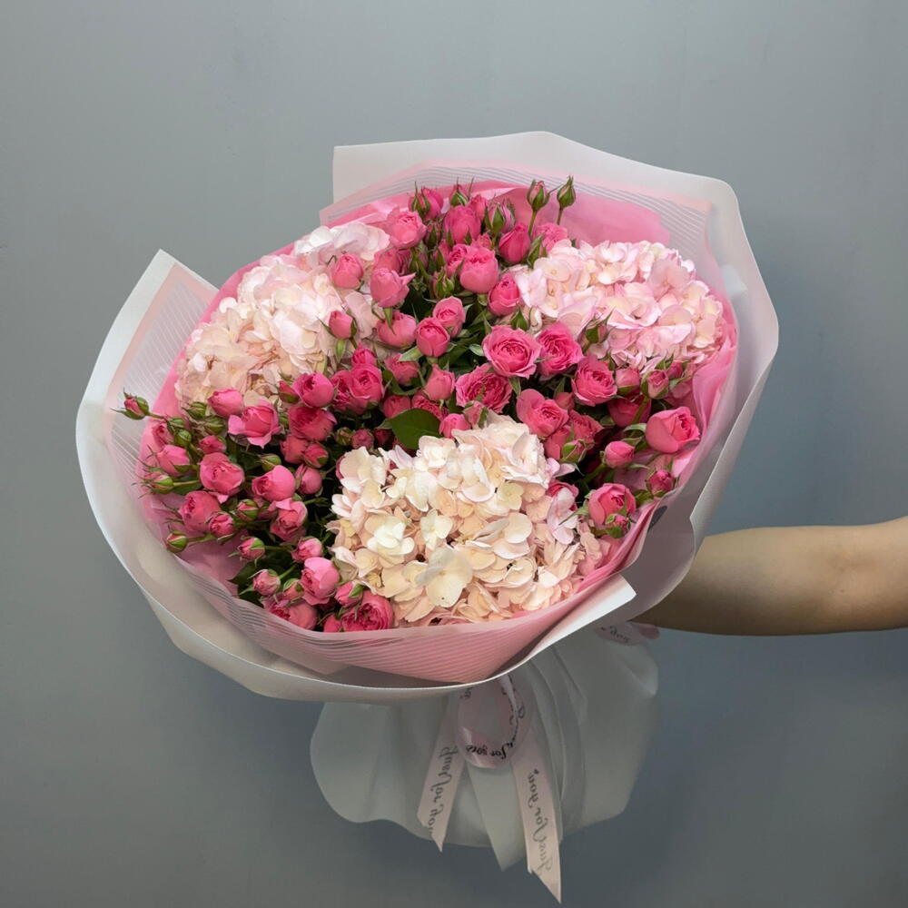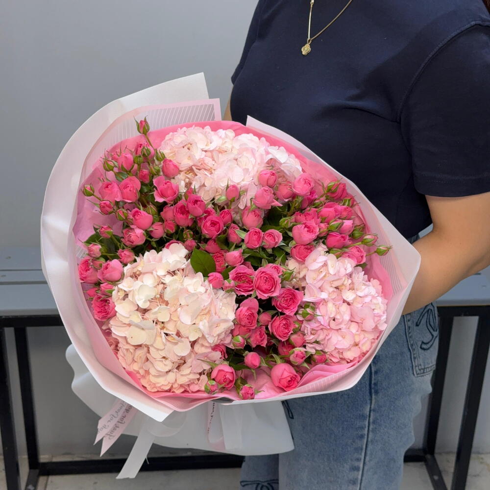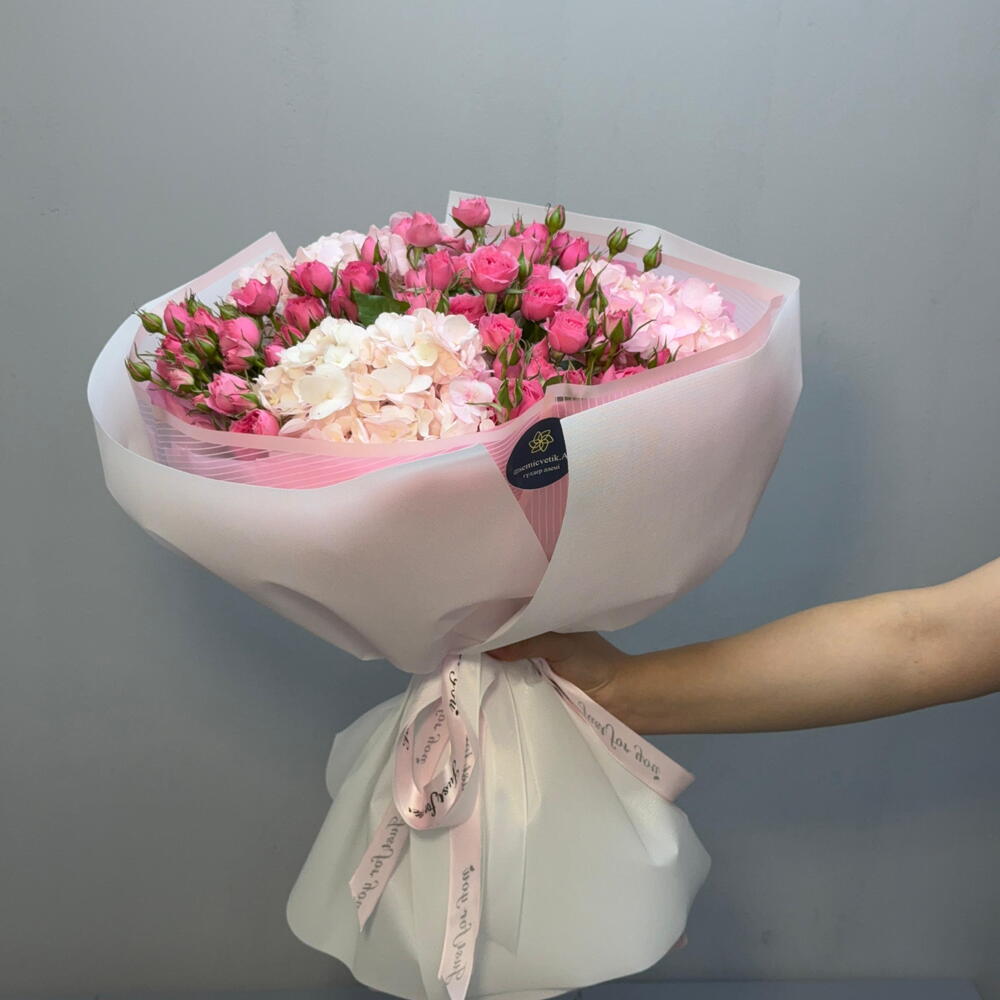 💗 Букет «Сладкая нега» 🌸 Розовая мечта, воплощённая в цветах! Пышные гортензии 💞 и кустовые розы 🌷 в нежных тонах создают ощущение уюта, ласки и тепла. Ароматный эвкалипт 🌿 придаёт композиции лёгкость и свежесть, словно прохладное утро. Белое оформление и розовая упаковка делают букет особенно изысканным и элегантным 🎀 ✨ Дарите этот букет, когда хочется сказать: «Ты — моя нежность», не говоря ни слова.