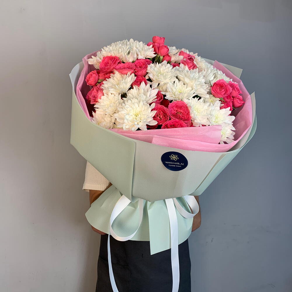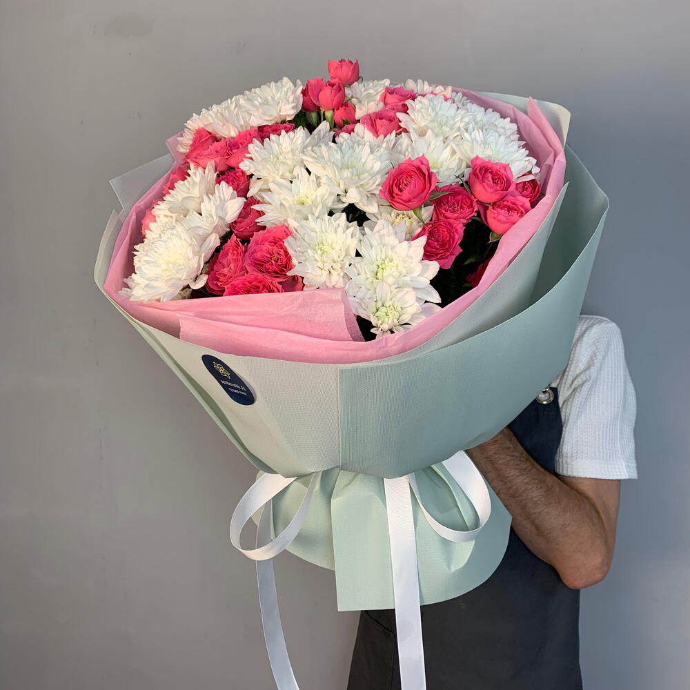 🌿✨ Букет «Нежное дыхание» ✨🌿 🤍 5 белоснежных кустовых хризантем — символ чистоты и искренности. 🌸 5 розовых кустовых роз добавляют тепла, нежности и романтики. 🎀 Белая репсовая лента и розовая тишью-подложка подчёркивают изящество композиции. 💚 Светло-зелёный фоамиран в оформлении делает букет свежим и лёгким, словно весеннее утро. Такой букет подойдёт для признаний, искренних поздравлений и тех моментов, когда слова излишни 🌷💫