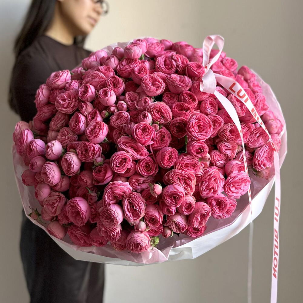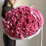 Роскошный букет из 51 ветки кустовой розы Giselle — это впечатляющий объём и нежность в каждой детали. Множество аккуратных бутонов на каждой веточке создают эффект пышного облака из мягких лепестков, которое выглядит одновременно торжественно и изысканно. Такой масштаб подчёркивает серьёзность намерений и глубину чувств. Букет смотрится статусно, элегантно и очень женственно — идеальный выбор для важного признания, юбилея или по-настоящему особенного события