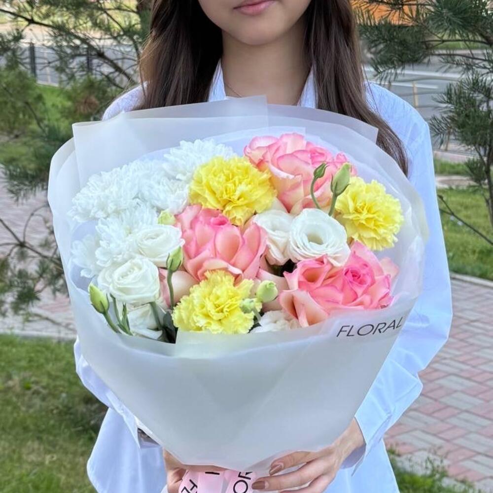 Lisianthus - 2 pcs Chrysanthemum bush - 1 pcs Rose - 3 pcs Carnation - 3 pcs