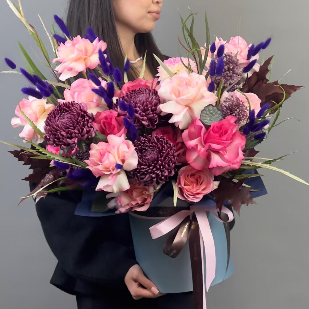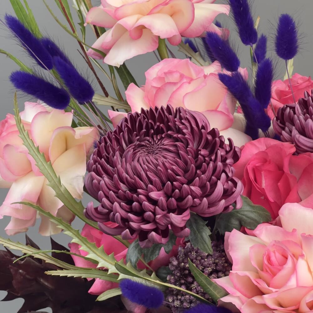 Rose - 17 pcs Chrysanthemum - 3 pcs Allium - 3 pcs Lagurus - 4 pcs grevillia - 1 pcs dahlias - 2 pcs кверсус - 2 pcs