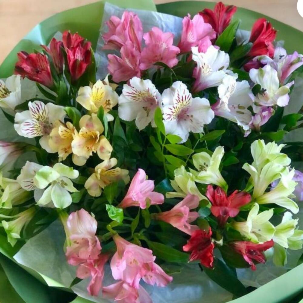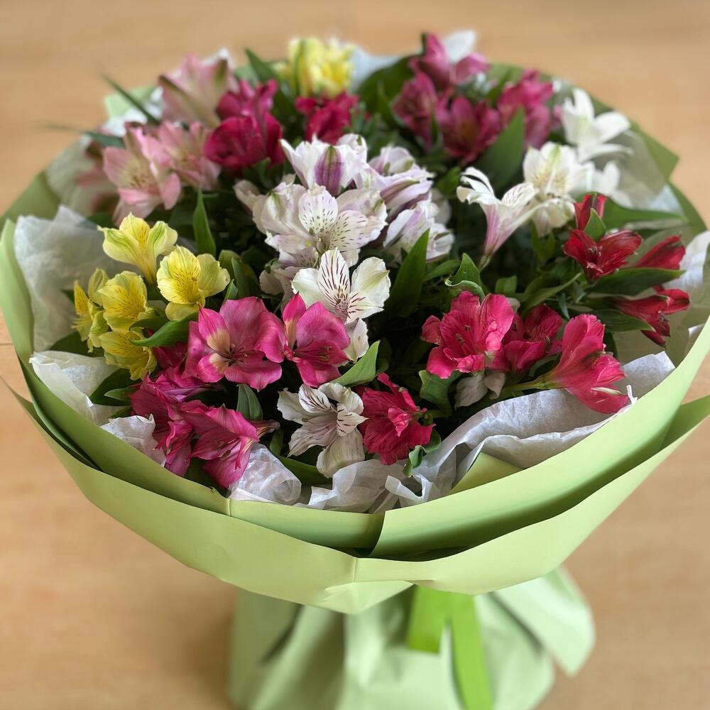 Букет из разноцветных альстермерий, точно подойдёт на любой праздник: День рождение, День свадьбы, учителю, девушке или маме, а также коллеге по работе. Букет очень стойки будет долго радовать получателя. P.S. Цвета альстермерий могут меняться в зависимости от поставки.