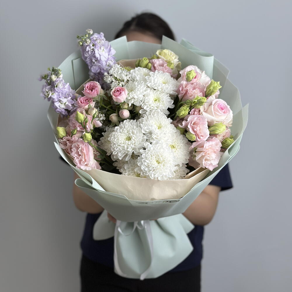 Matthiola - 2 pcs Chrysanthemum bush - 2 pcs Bush rose - 1 pcs Eustoma - 5 pcs