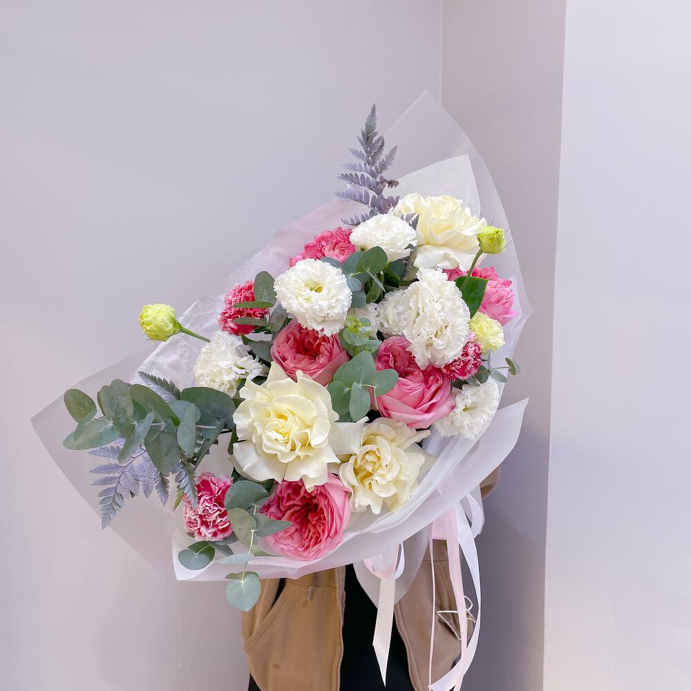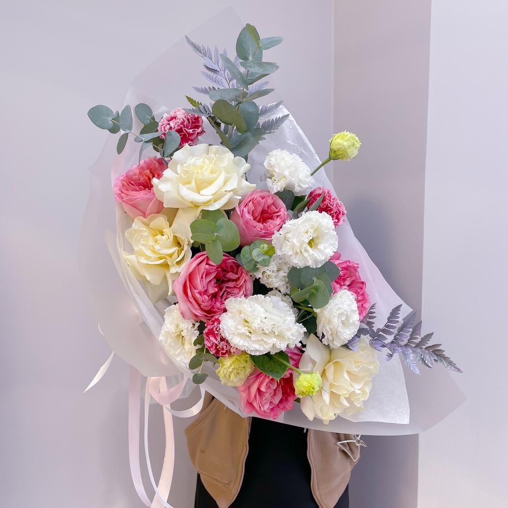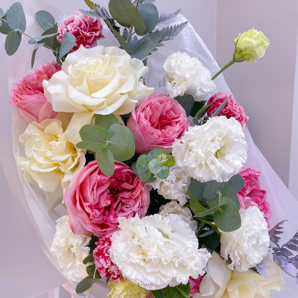 Eucalyptus - 1 pcs Dianthus - 3 pcs peony - shaped roses - 5 pcs Leder - 2 pcs inverted roses - 3 pcs eustoma - 2 pcs