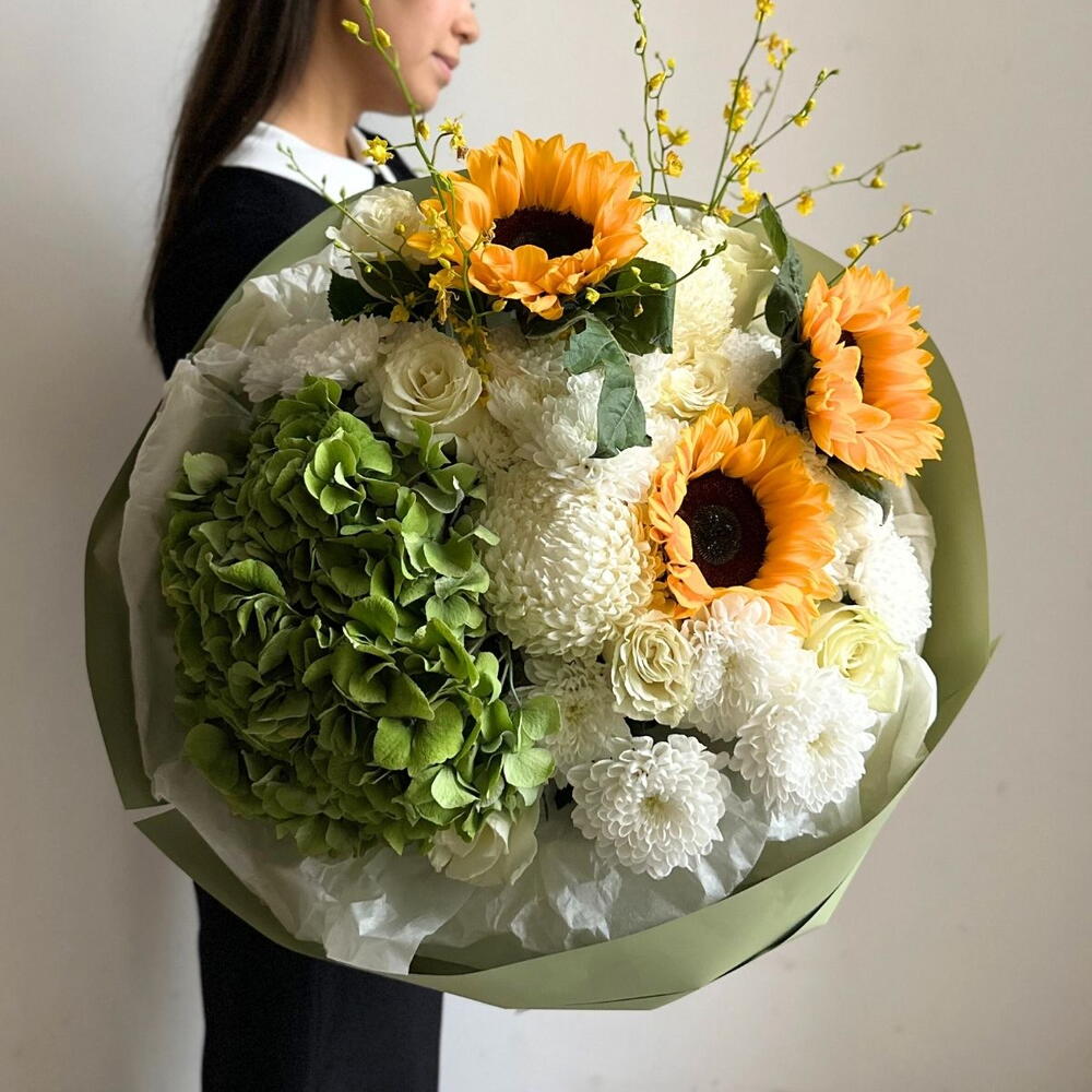 Букет из голландской гортензии, подсолнухов, онцидиума, хризантем и роз - как солнечный поцелуй — тёплый, сияющий и полный жизни