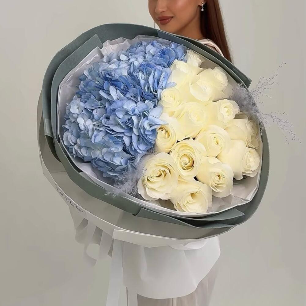 Состав: 2 гортензии, 15 роз, перо, оформление. 💬 Ультра стильный букет в модном оформлении — с пером как акцент.