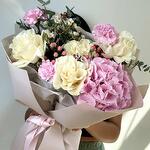 Waxflower - 2 pcs Hypericum - 2 pcs Hydrangea - 1 pcs Eucalyptus - 1 pcs Carnation - 3 pcs Rosa mondial - 4 pcs