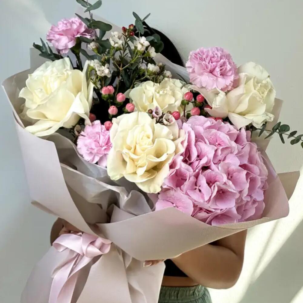Waxflower - 2 pcs Hypericum - 2 pcs Hydrangea - 1 pcs Eucalyptus - 1 pcs Carnation - 3 pcs Rosa mondial - 4 pcs