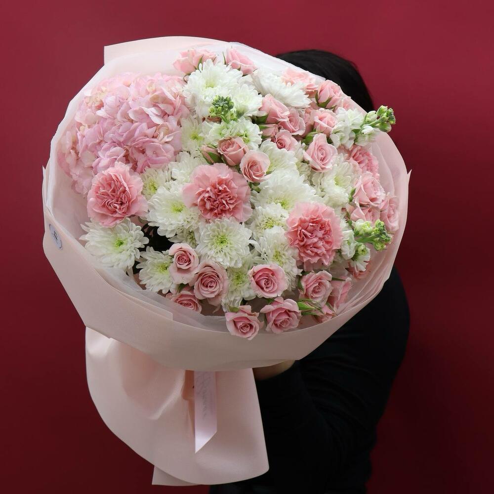 Hydrangea - 1 pcs Matthiola - 3 pcs Chrysanthemum - 5 pcs Carnation - 3 pcs Spray rose - 10 pcs