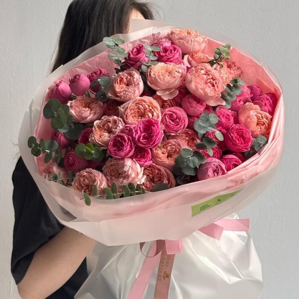Bright, romantic and very striking mono-bouquet that immediately evokes a "wow" reaction. Peony-like spray roses in a rich pink-raspberry palette create a dense, voluminous look, while eucalyptus adds freshness and a noble contrast. "Barbie Garden" — a bouquet for confessions, compliments and a confident gesture of love. Perfect for February 14 if you want to give not just flowers, but a mood.